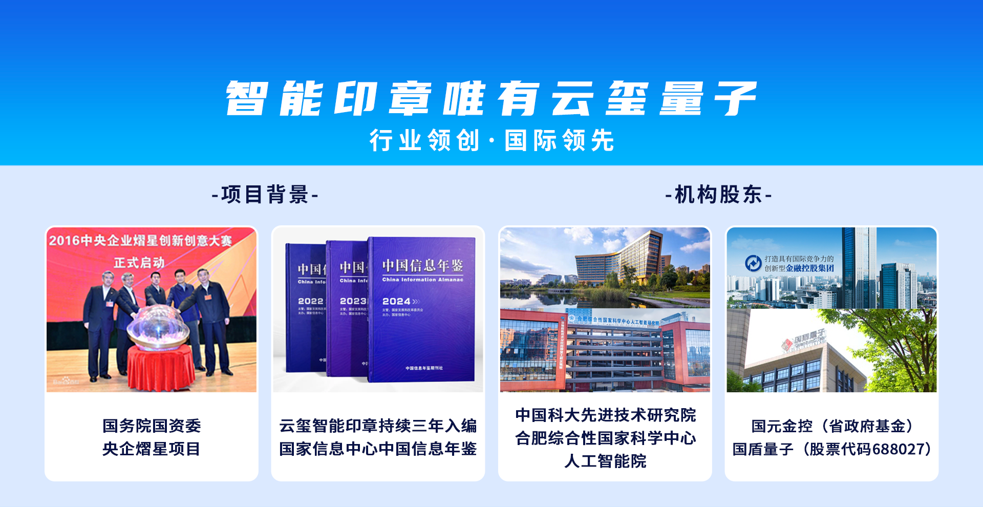 安徽云璽量子科技有限公司是合肥市量子信息產業重點企業,國家信創工委會成員企業,中國信創500強企業。主營業務包括量子安全智能印簽、量子安全智能辦公、量子安全云服務,為政企客戶提供量子安全整體解決方案。